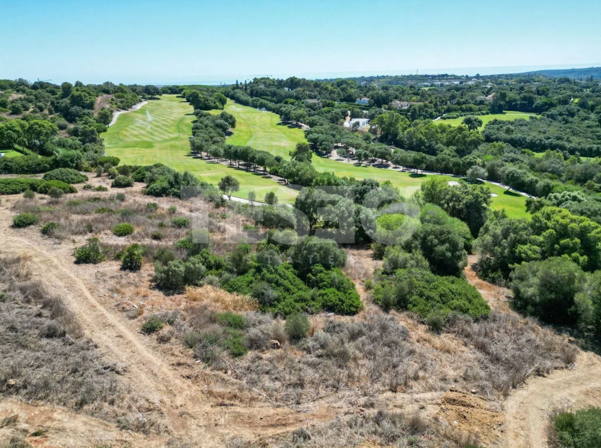 Das Grundstück bietet einen Panoramablick über den Golfplatz, das Meer und die Berge.