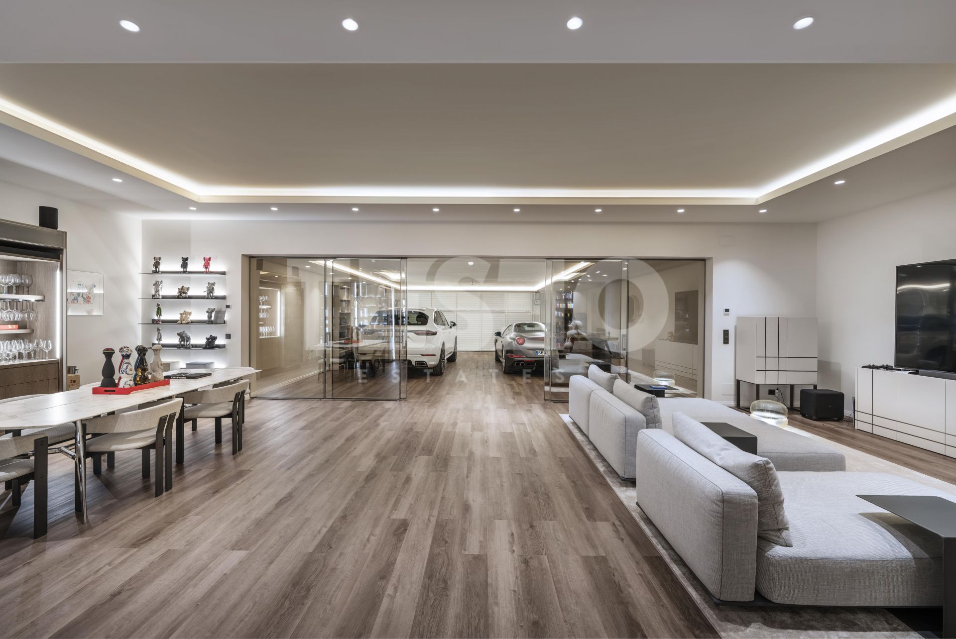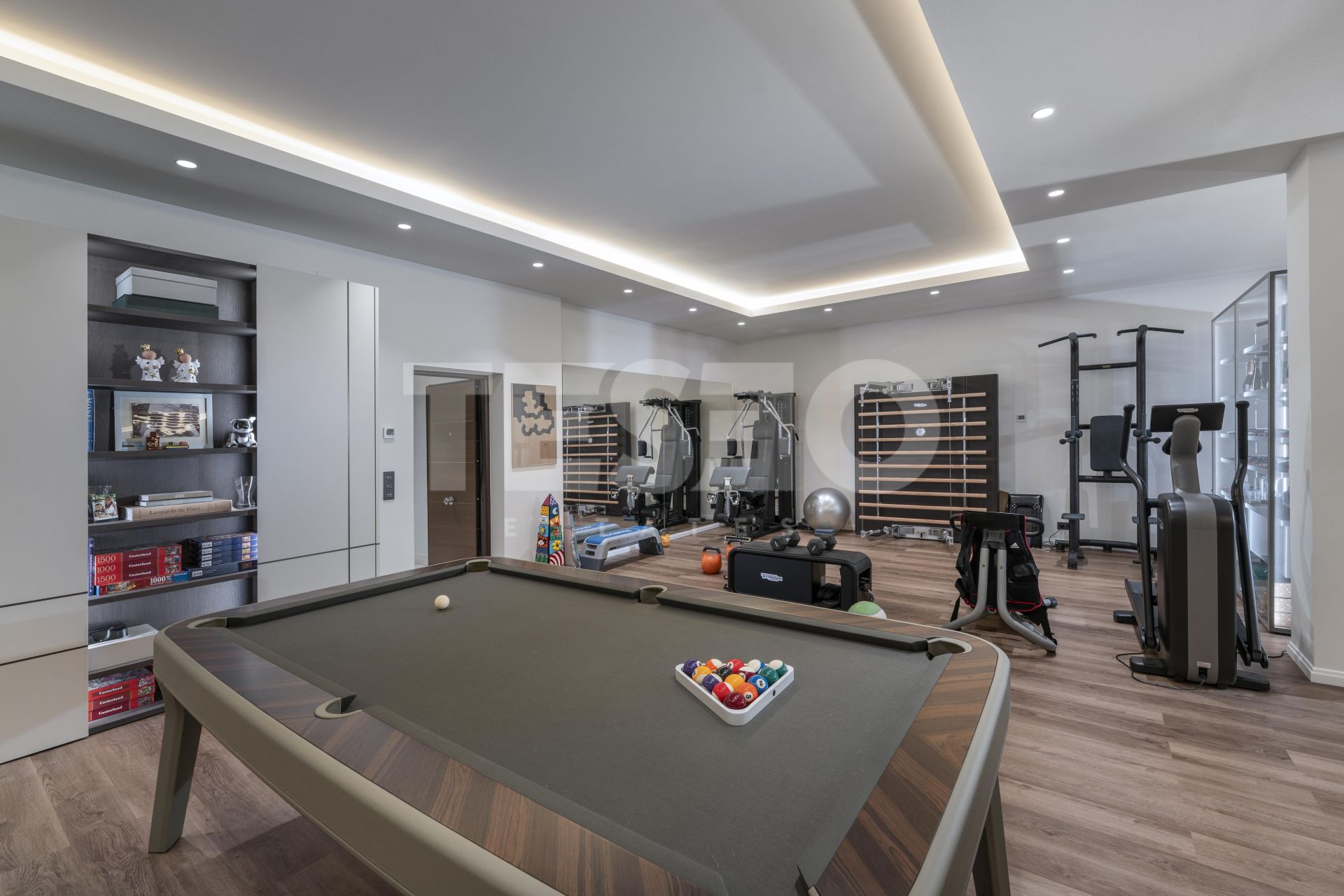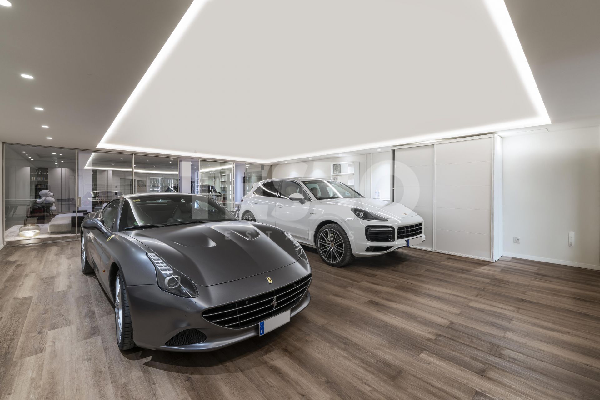 - The property also includes a spacious basement with multiple areas: an auxiliary kitchen with laundry area equipped with Miele appliances, a large 36 m² dressing room designed by Uecko, and a multifunctional games room with fitness area, Pilates equipment, billiard table, and a spacious lounge area, as well as a large garage separated by glass doors, for two cars, electric charger, and a private elevator within the house.