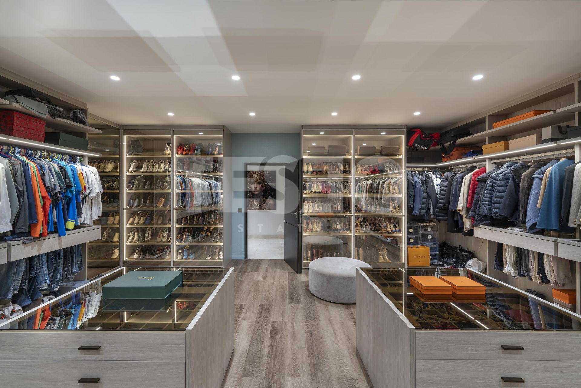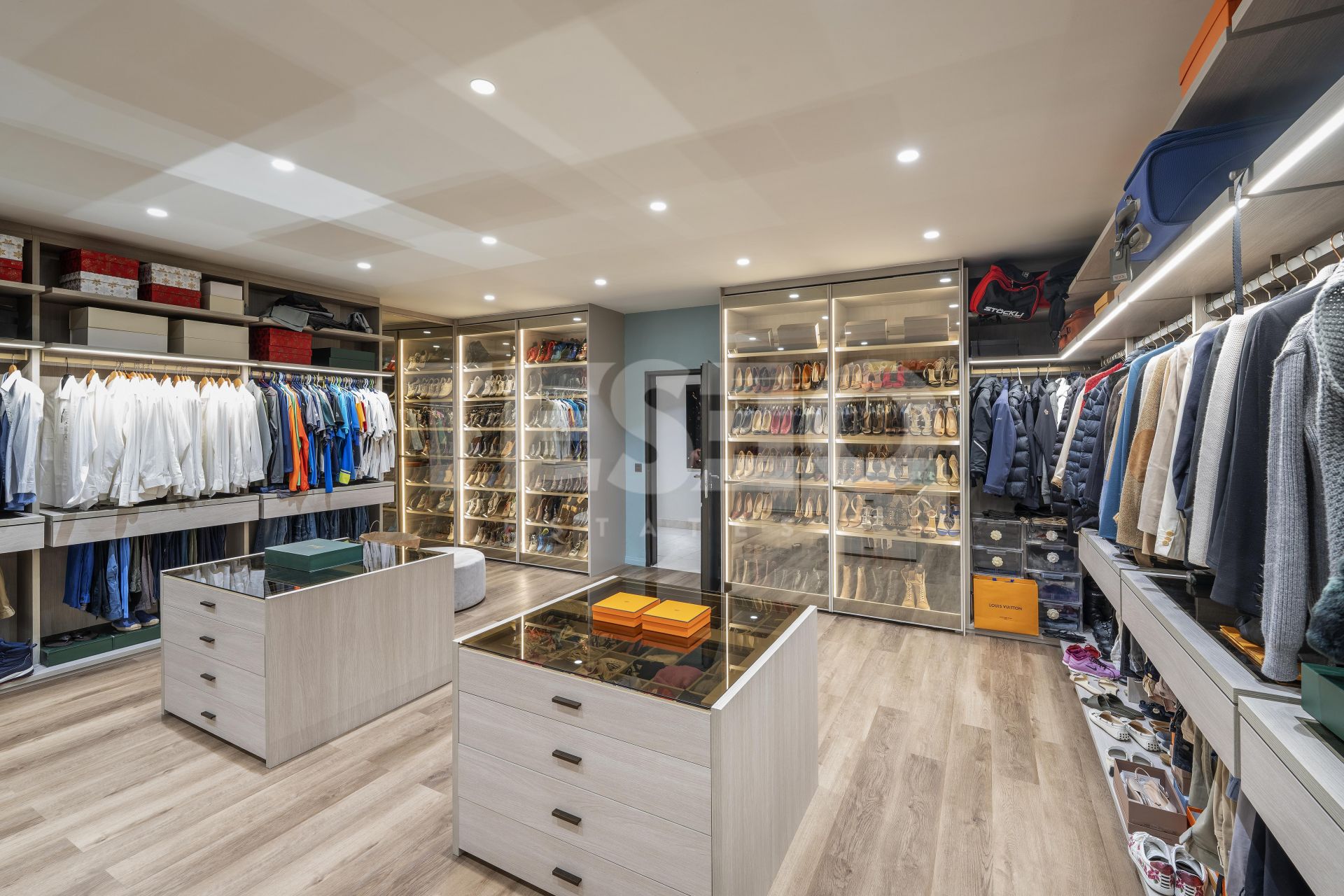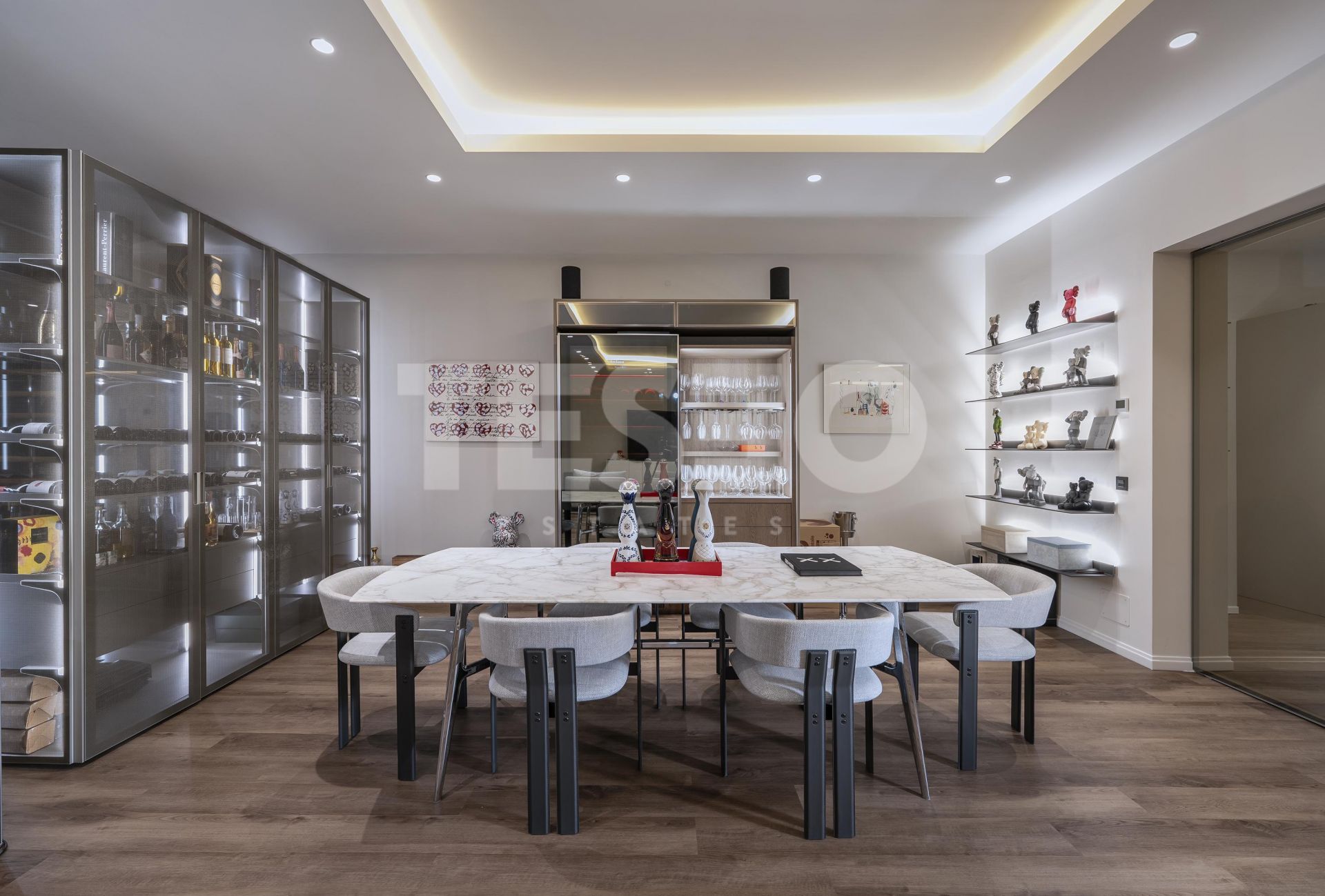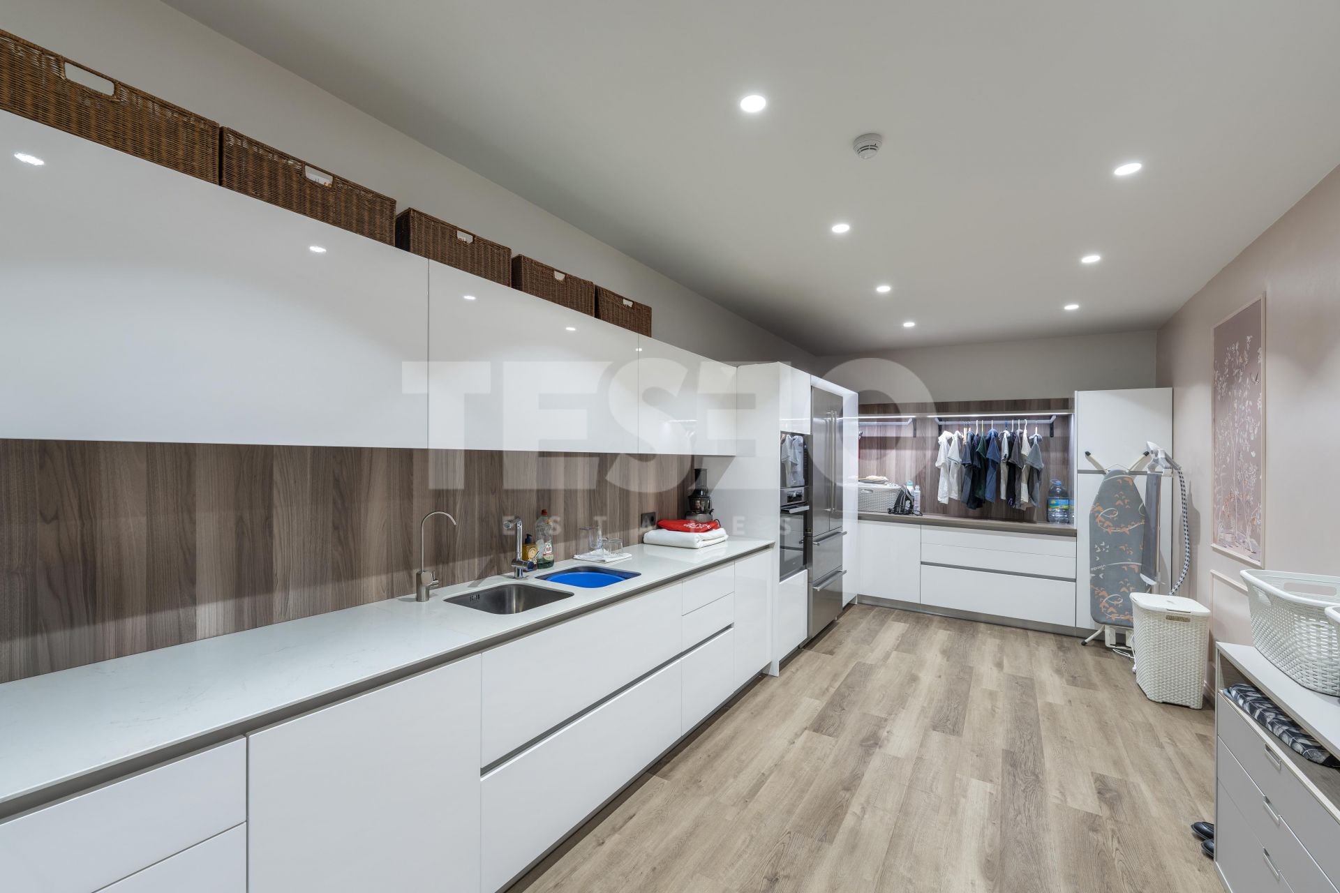 - The property also includes a spacious basement with multiple areas: an auxiliary kitchen with laundry area equipped with Miele appliances, a large 36 m² dressing room designed by Uecko, and a multifunctional games room with fitness area, Pilates equipment, billiard table, and a spacious lounge area, as well as a large garage separated by glass doors, for two cars, electric charger, and a private elevator within the house.