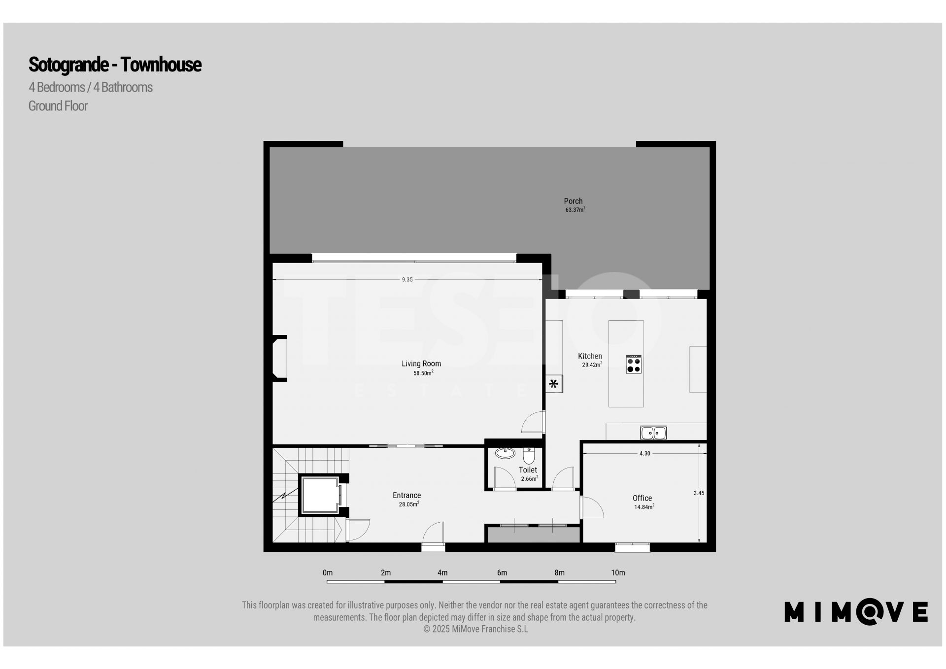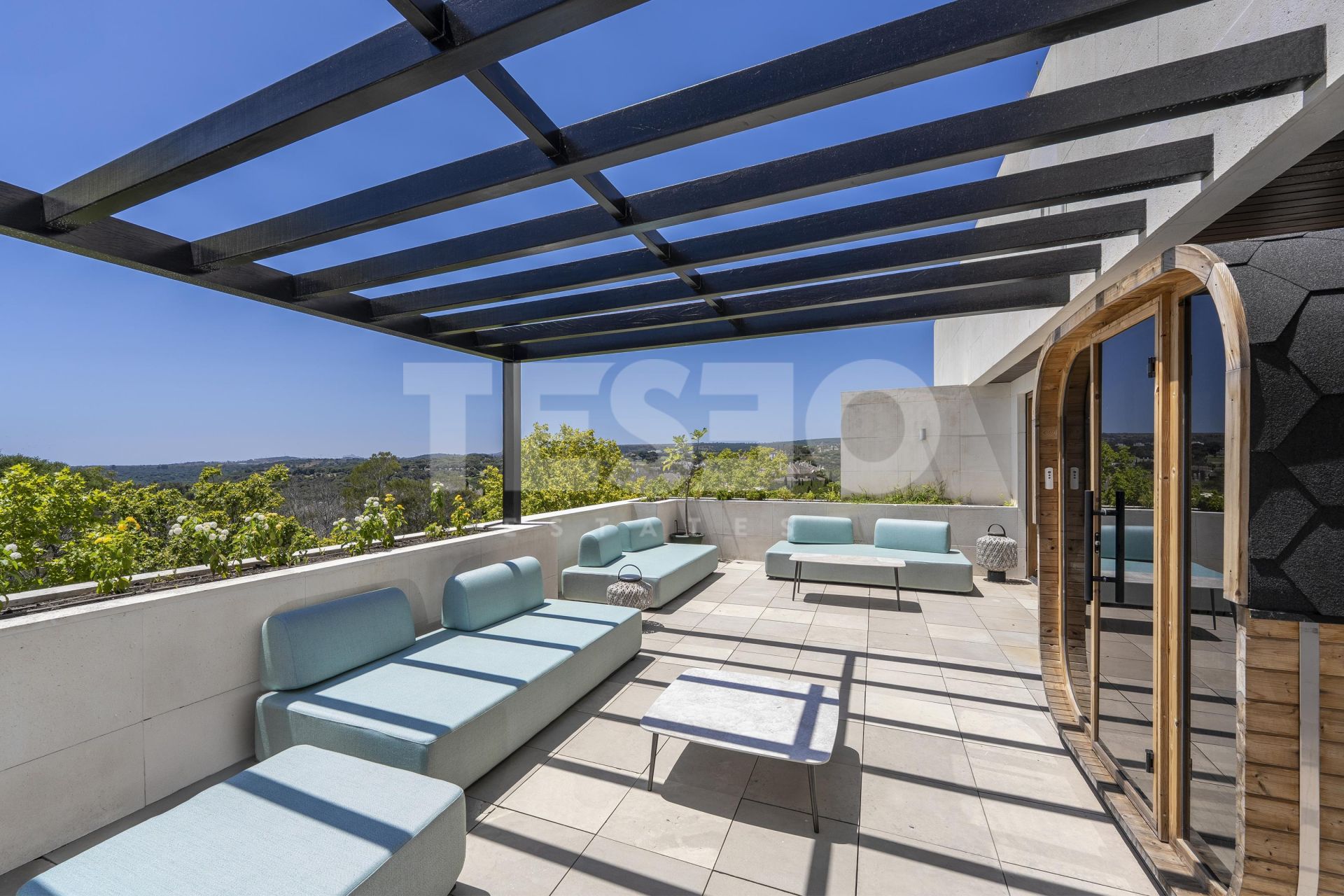 - The first floor offers three en-suite bedrooms connected by a large shared terrace.