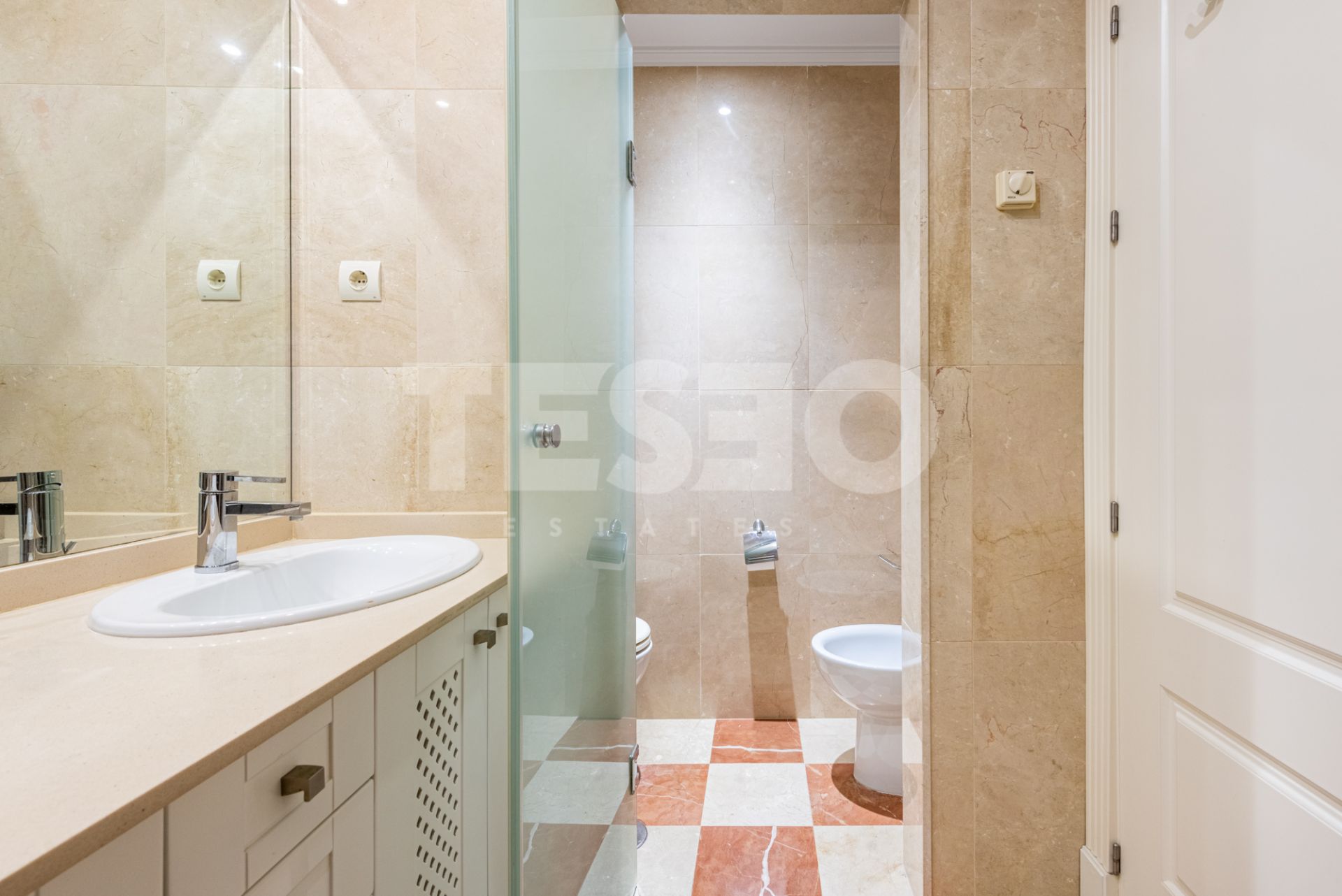 It features a separate living room with marble floors, a modern and functional kitchen, and a spectacular terrace ideal for relaxation and leisure. The property includes a parking space and is situated in a building with an elevator, communal swimming pool, and alarm system. It is equipped with underfloor heating and air conditioning, ensuring optimal climate control year-round. The apartment is impeccably maintained and ready to move in.