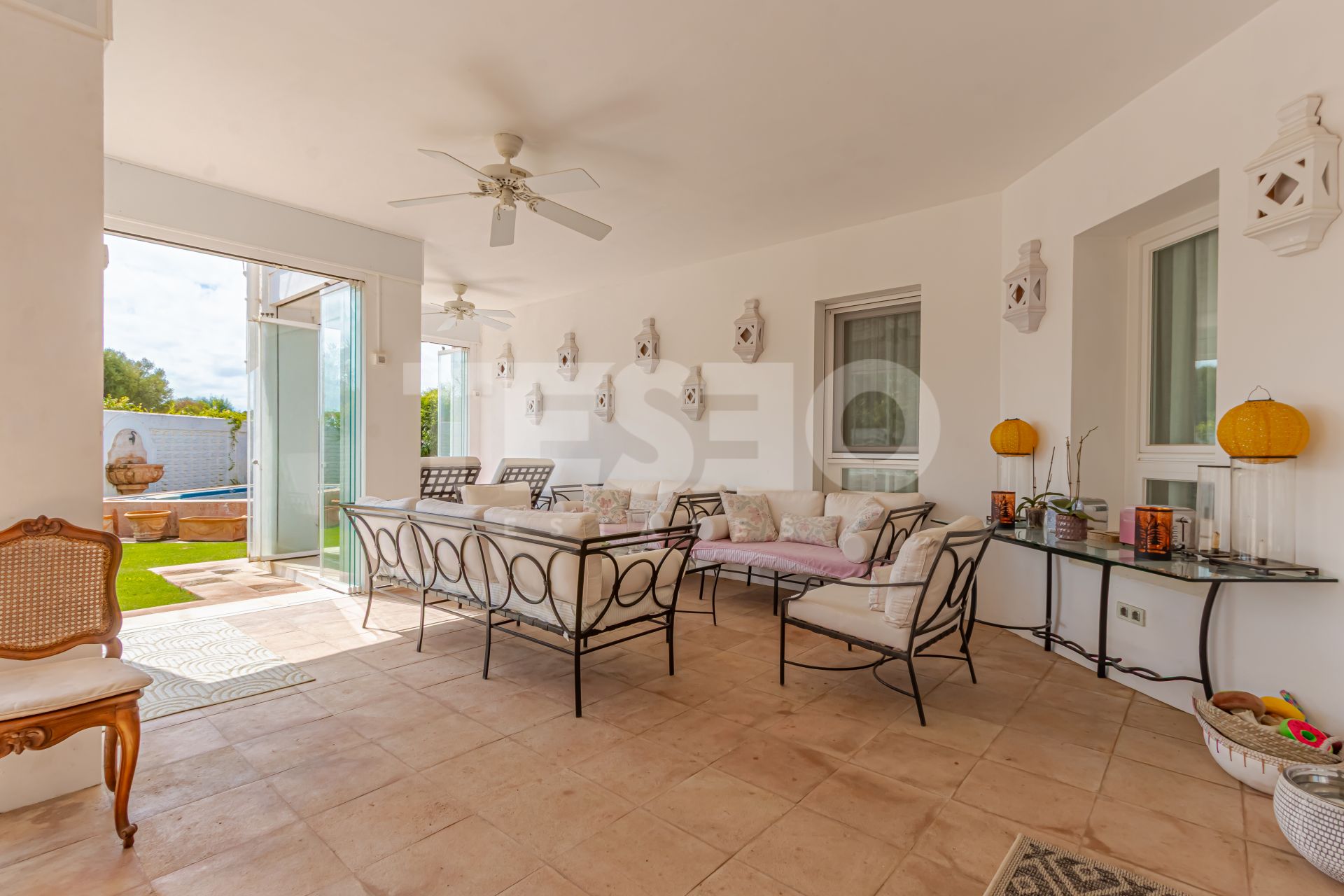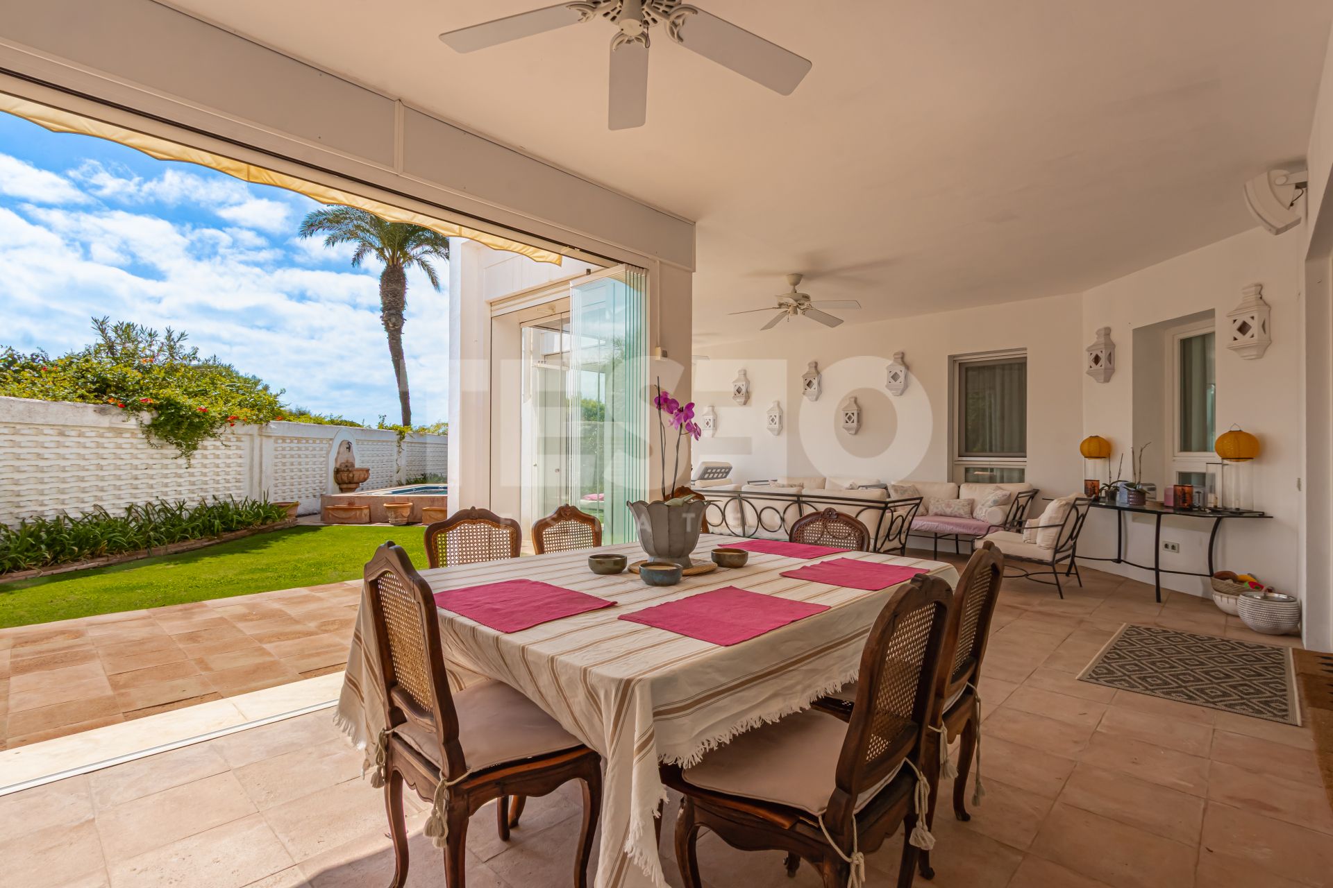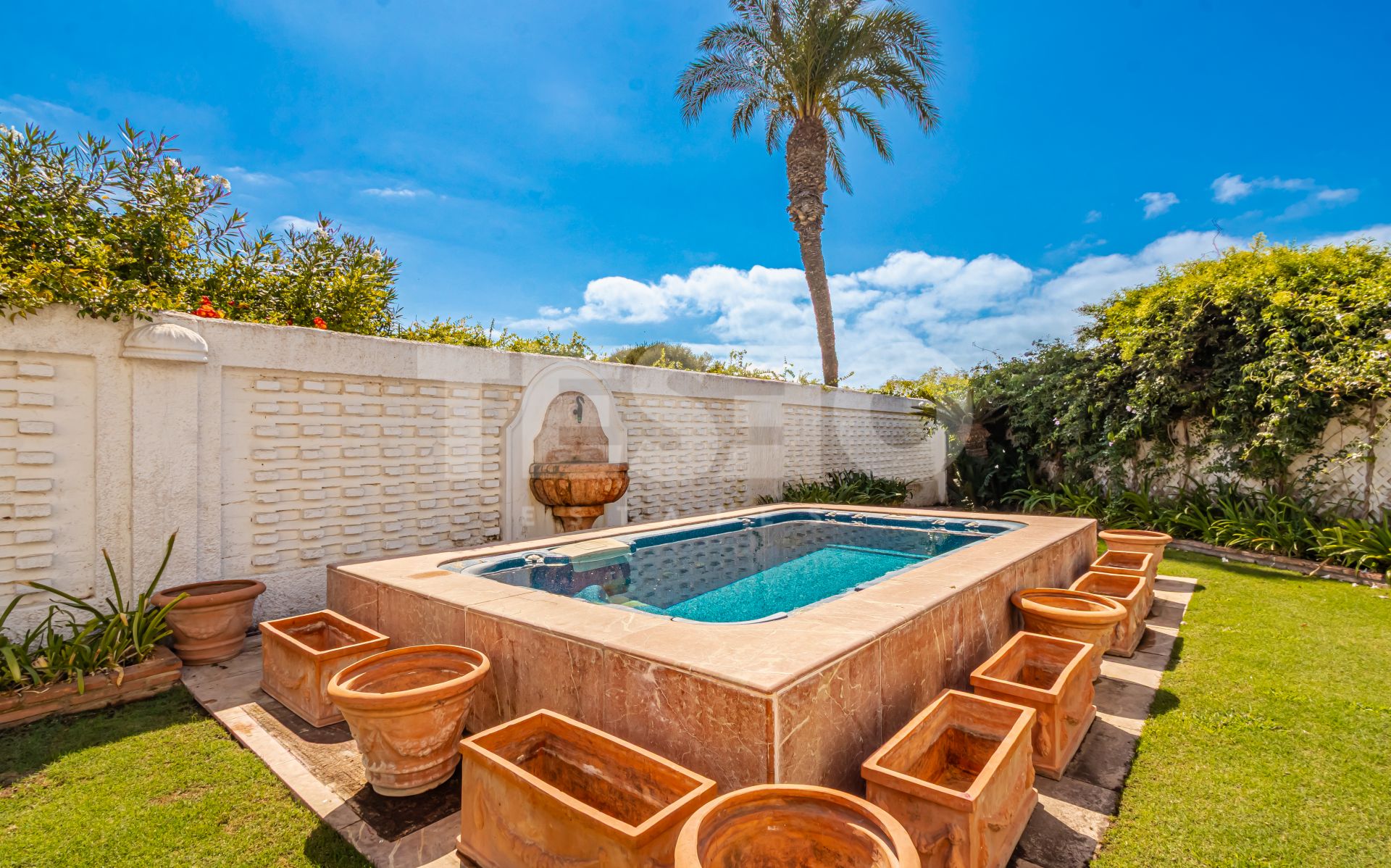 One of very few frontline beach properties in Sotogrande- these very rarely come on the market. This is a single storey semi detached house with roof terrace in the gated "Bungalows" community next to the Real Golf course of Sotogrande and metres from the Sotogrande beach. This house was totally reconstructed in 2010 and is really a gem of a property. When you walk inside, you are looking through to the very pretty walled garden with plunge pool (currently a Jacuzzi). It has a very open plan feel with plenty of light from the large windows and various sky lights. On this floor you have a living room, kitchen with adjoining utility, 2 en-suite double bedrooms, a further double bedroom and master suite with french doors out to the garden and great dressing area. There is a very large covered terrace on the ground floor connecting the garden and living room. It is closed with glass curtains so you can enjoy the space all year round. From a comfortable staircase at the side of the garden you go up to possibly one of the best entertaining roof terraces by the sea! The protected views are a panorama of the beach, Rock of Gibraltar and the Guadalquivir cork forest all back by the Mediterranean Sea. There is a kitchen already installed making this THE entertaining terrace. There is air conditioning throughout, underfloor heating, solar panels, double glazed sliding windows, 2 car port spaces, a golf cart and purchase of members shares for the Sotogrande Real Club de Golf (separate negotiation).