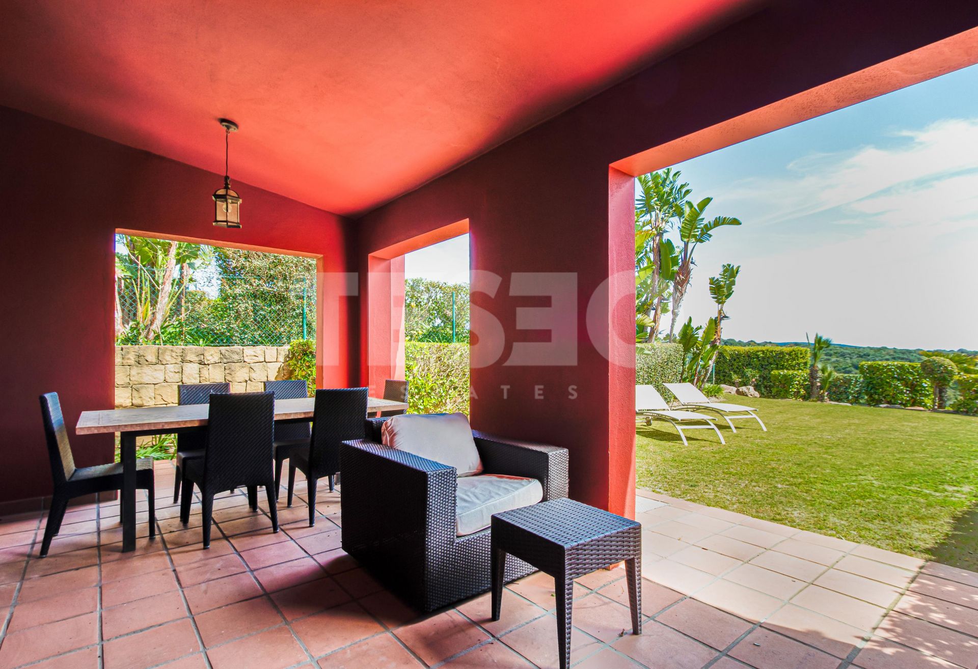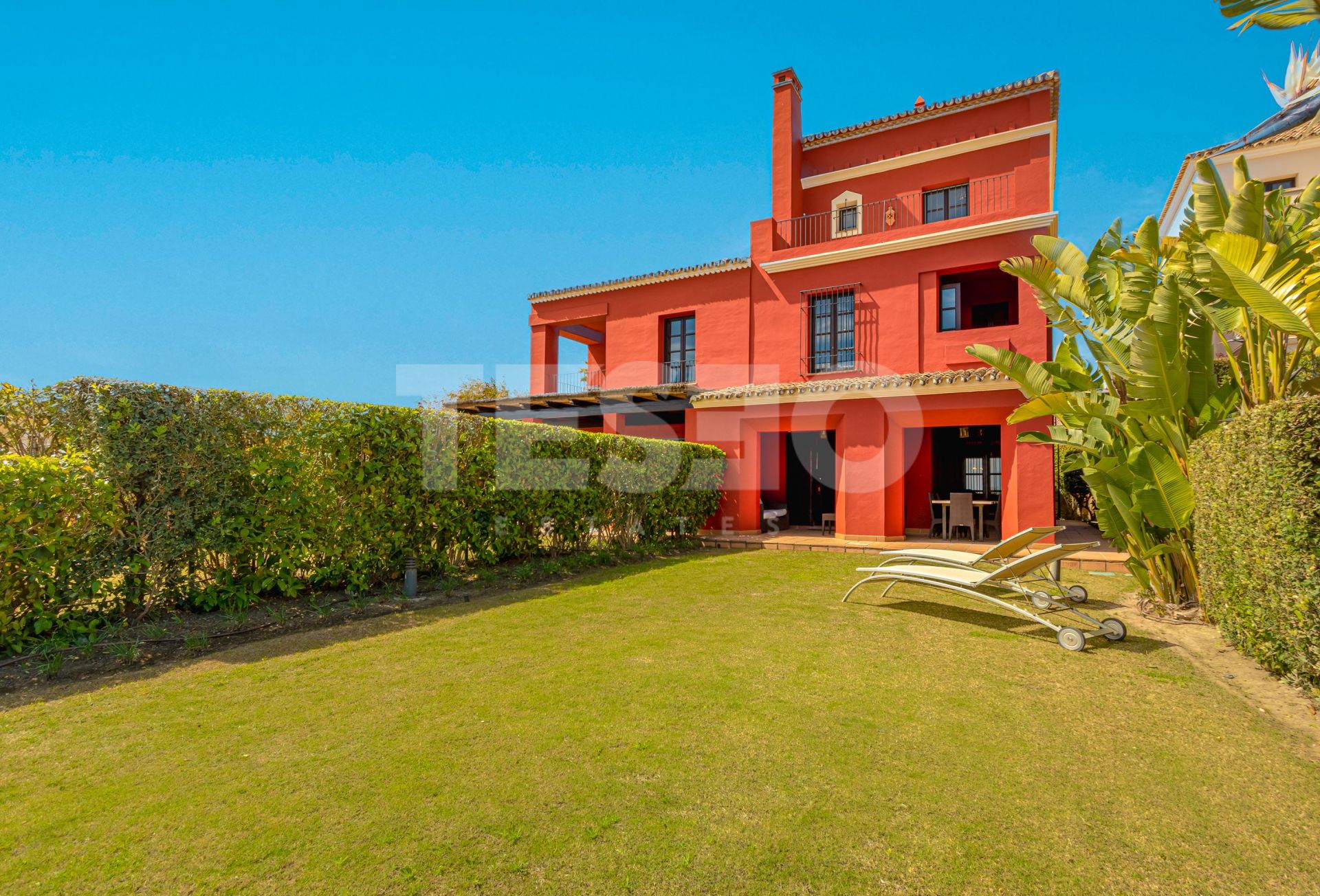 Casa adosada de lujo con jardín privado en Los Cortijos de la Reserva con vistas al mar y a la montaña.