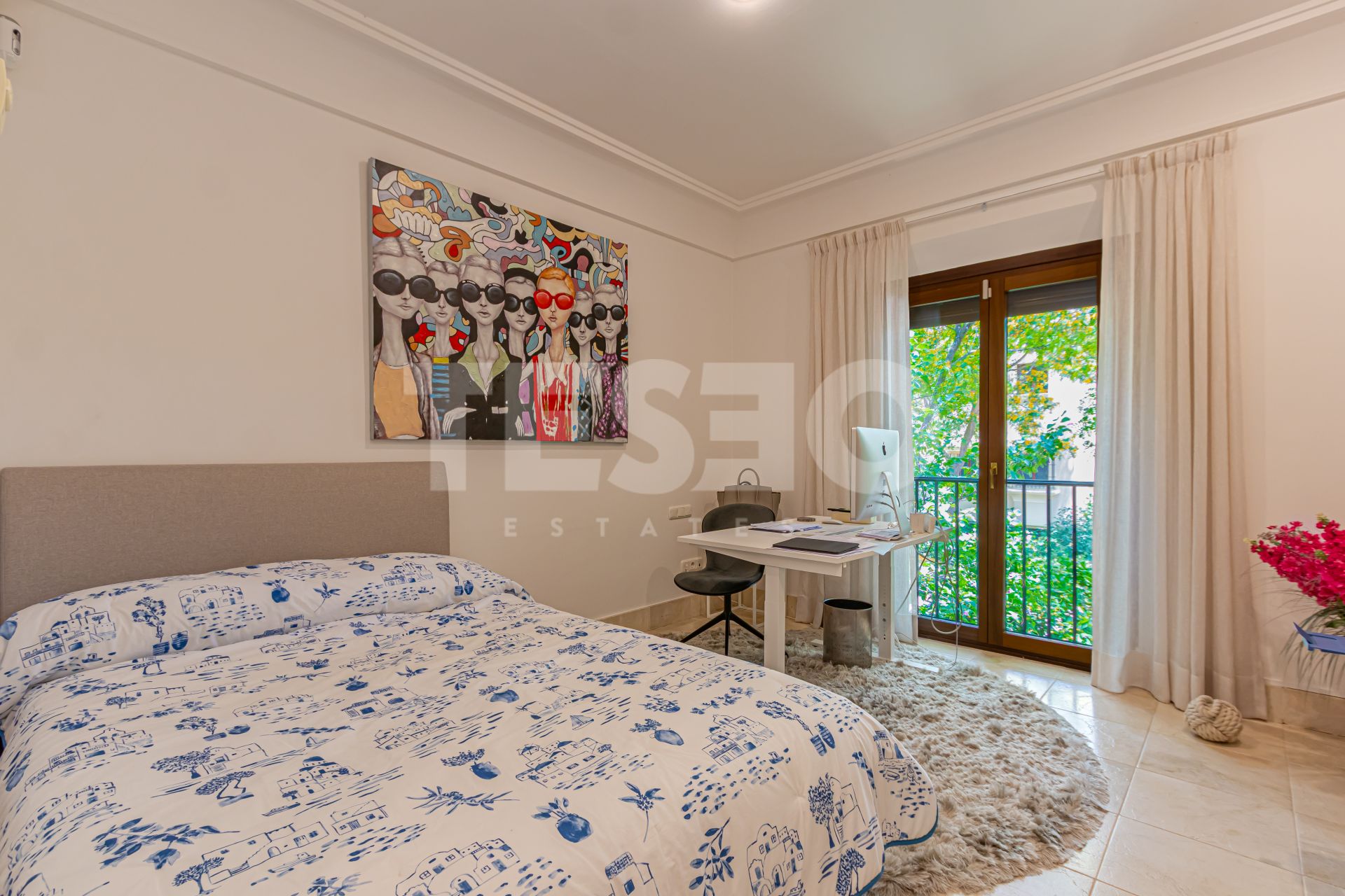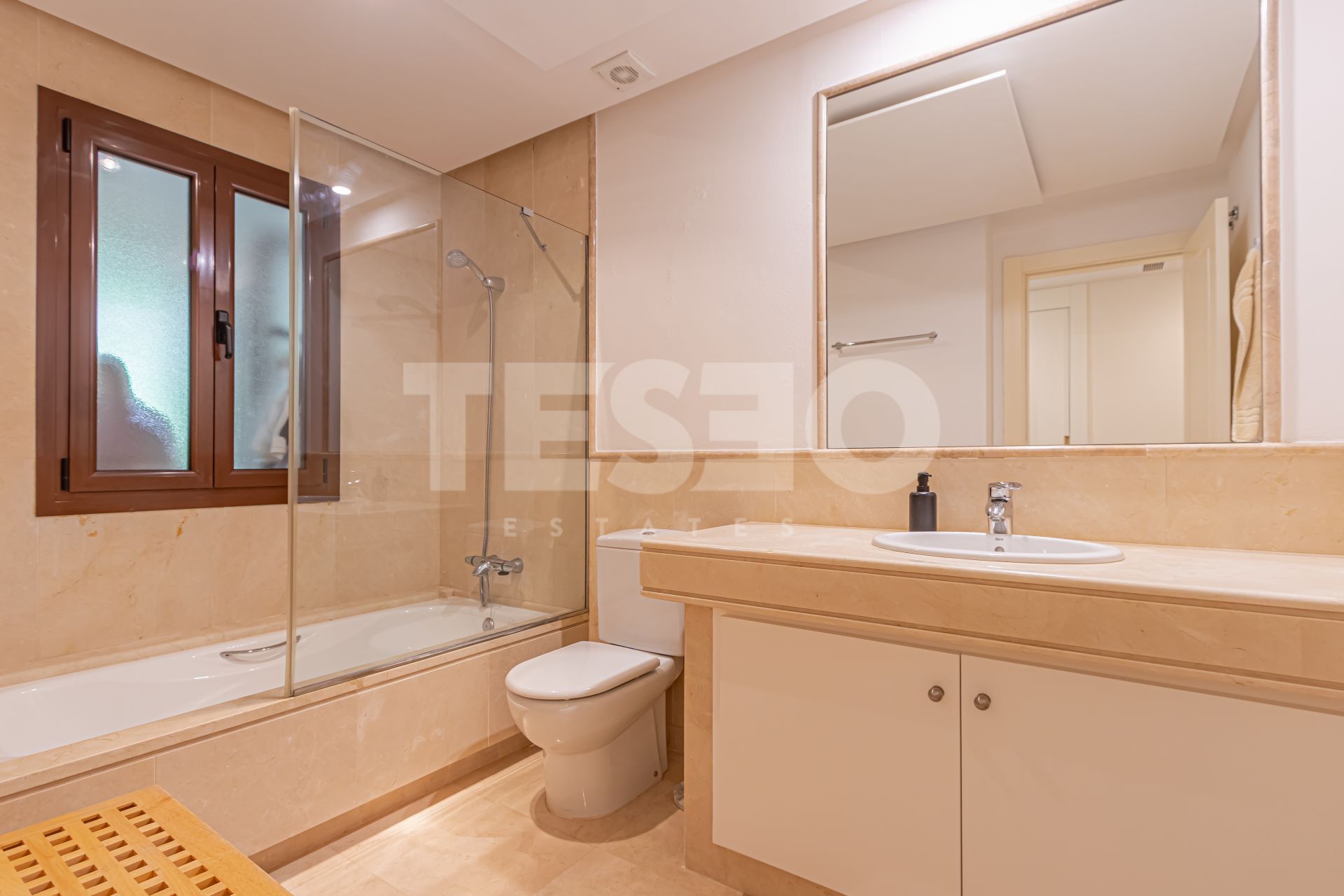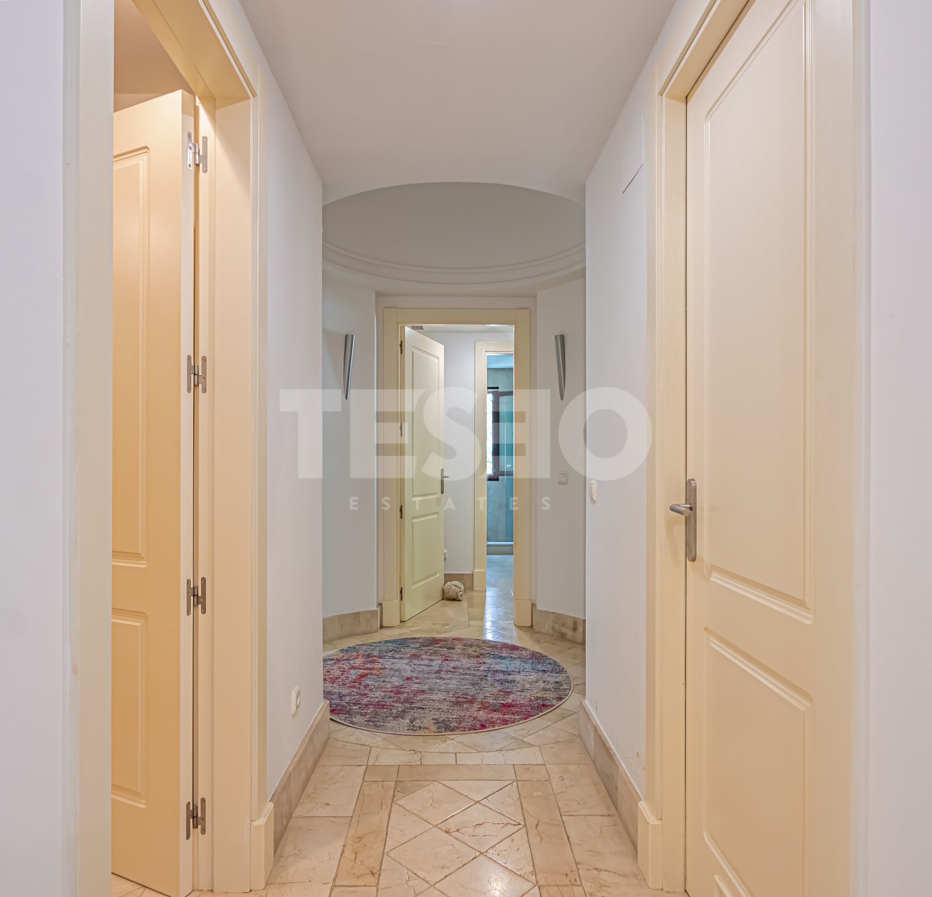 El apartamento dispone de tres dormitorios, cada uno con su propio baño en suite, además de un aseo de cortesía para invitados. El interior se caracteriza por acabados de alta calidad, como suelos de mármol, armarios empotrados y una cocina completamente equipada. El salón cuenta con chimenea, creando un ambiente acogedor, y la climatización está asegurada mediante suelo radiante en toda la vivienda e instalaciones individuales de aire acondicionado. El acceso a internet Wi-Fi y la excelente conservación del inmueble completan las prestaciones interiores.