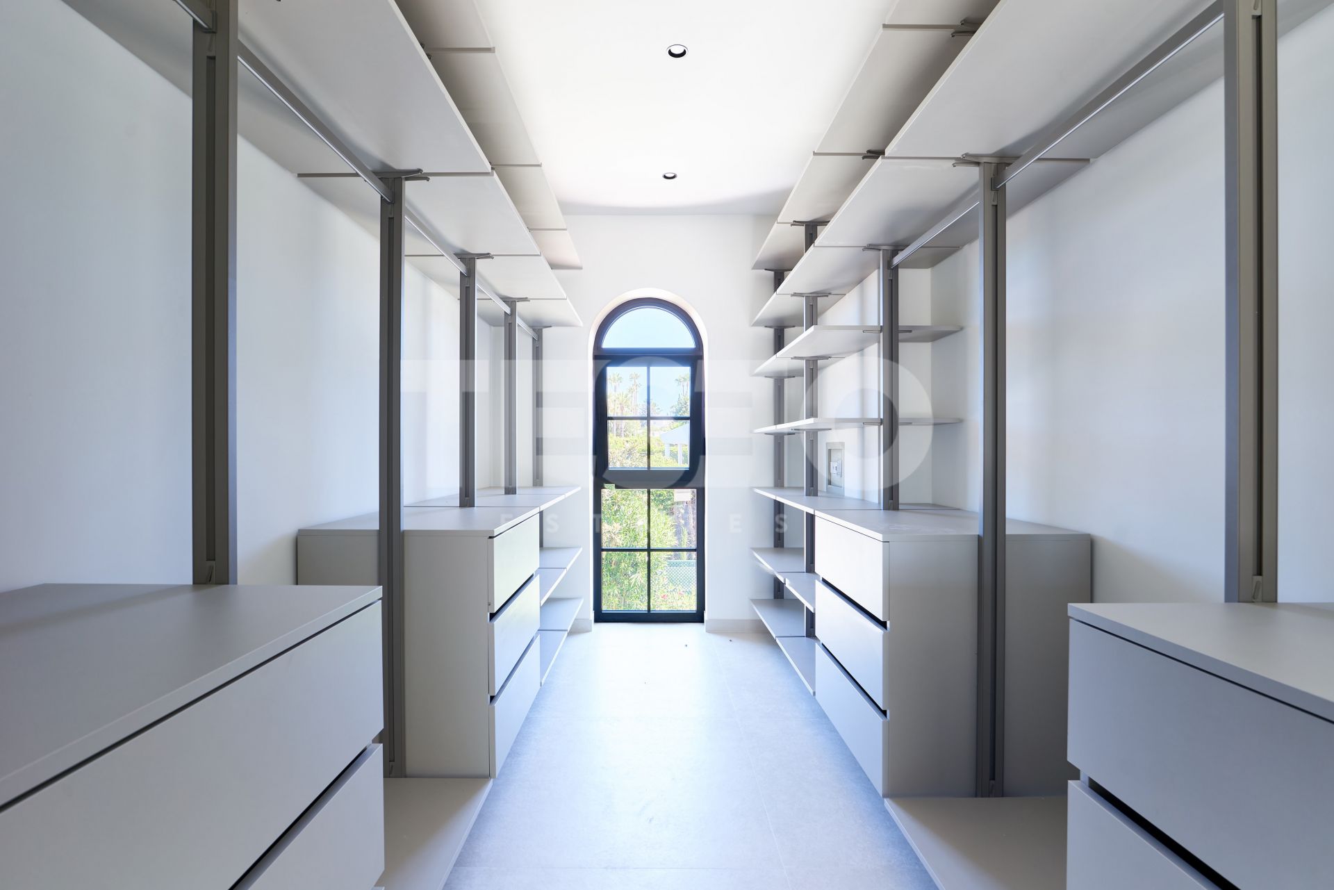 • El dormitorio principal, ubicado en la segunda planta, dispone de un baño en suite privado con ducha y bañera, proporcionando un ambiente de spa y relajación. También se abre a un balcón panorámico con paneles de vidrio, que ofrece impresionantes vistas a los jardines. Este espacio es perfecto para disfrutar de un café por la mañana o relajarse por la noche. Además, cuenta con un vestidor independiente, diseñado con gran atención al detalle y con un amplio espacio de almacenamiento.