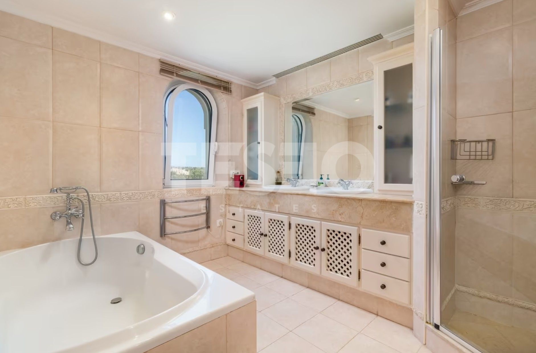 El dormitorio de la planta baja tiene vistas al jardín. La villa cuenta con suelos de mármol, aire acondicionado y calefacción por suelo radiante.